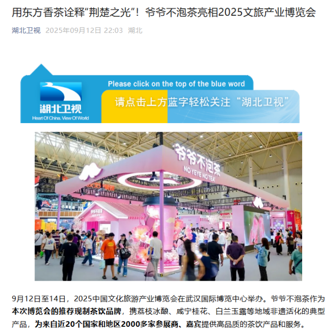 湖北卫视:作为更受年轻人喜爱的奶茶品牌,爷爷不泡茶通过生动展台和多元互动游戏设计,把展览办成了受年轻参观者喜爱的高颜值“游园会”,成为人气最高的展厅之一。奶茶出品区最火爆时超过30人在排队,喝爷爷不泡茶、逛文旅博览会,成为现场高频出现的潮流选择。