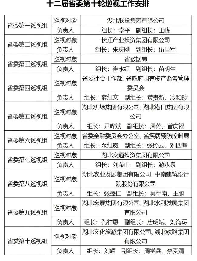 经省委批准,十二届省委第十轮巡视派出10个巡视组,对11家省属企业和5家省直单位党委(党组)开展常规巡视,同步开展选人用人、落实意识形态工作责任制、巡察工作专项检查。 (湖北日报记者杨宏斌、通讯员李辉辉)