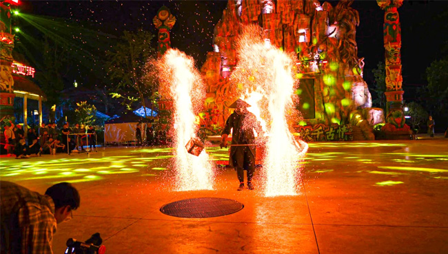 火人狂欢节现场带来了震撼的视觉盛宴。无人机“火凤凰”在天空振翅翱翔,栩栩如生;《焰舞天华》表演更是将现场气氛推向高潮,舞者们与火焰共舞,展现力与美的完美结合,引爆游客们的视觉沸点。