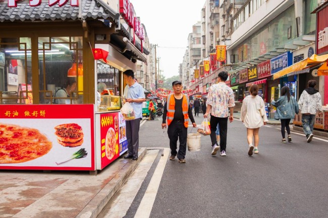 湖北金飞扬新增100个垃圾桶并设立收集点,该公司党支部书记魏邦发带队制定专项方案:实行“白+黑”两班倒,每班28名保洁员,采用“定点值守+流动巡查”模式作业。入口处,保洁员守着移动垃圾车随时收垃圾;街巷中,“快捡队”巡回作业,发现污渍立即处理,直至晚11时。