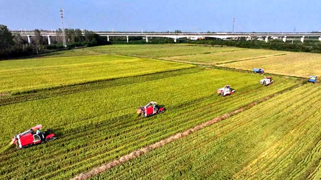 金秋时节,沃野流金。在湖北省随县均川镇均河口村,两千余亩香稻迎来集中抢收。收割机在田间往返穿梭,颗粒归仓的喜悦洋溢在广袤田野。