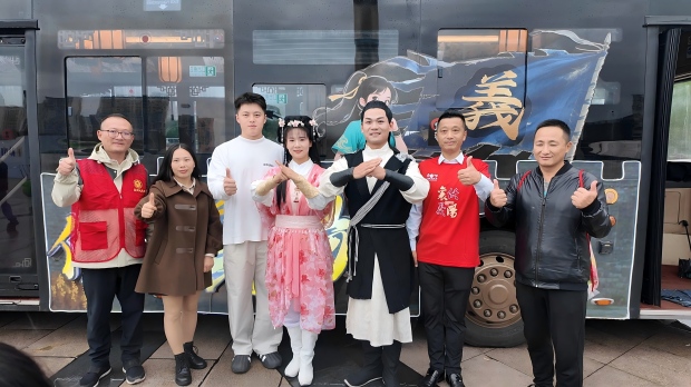 当天下午,在2025襄阳马拉松博览会现场,“侠义襄阳”主题公交车甫一亮相,便迅速成为参赛选手和市民打卡的热门地点。车上,“郭靖”和“黄蓉”化身文明大使,以拍摄短视频的形式向市民发出文明倡议。
