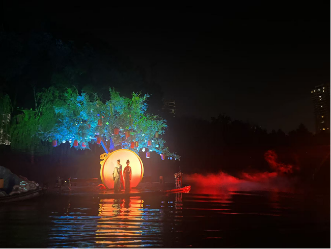 夜幕降临,孝感槐荫河波光粼粼,一场融合科技与文化的“槐荫船说”行进式水上夜游演出准时拉开帷幕。游船缓缓前行,智能水幕在船头次第展开,5D全息投影与5G物联网技术交织,将董永与七仙女“路遇”“织绢”的经典传说生动再现,360°沉浸式体验让游客仿佛穿越千年。自今年4月启幕以来,“槐荫船说”已成为孝感文旅的“流量担当”,串联起董永公园、文昌阁、麻糖米酒博物体验馆等景点,形成“研学+美食+休闲”多元文旅产品体系,让“孝爱之地甜蜜之城”的形象深入人心。
