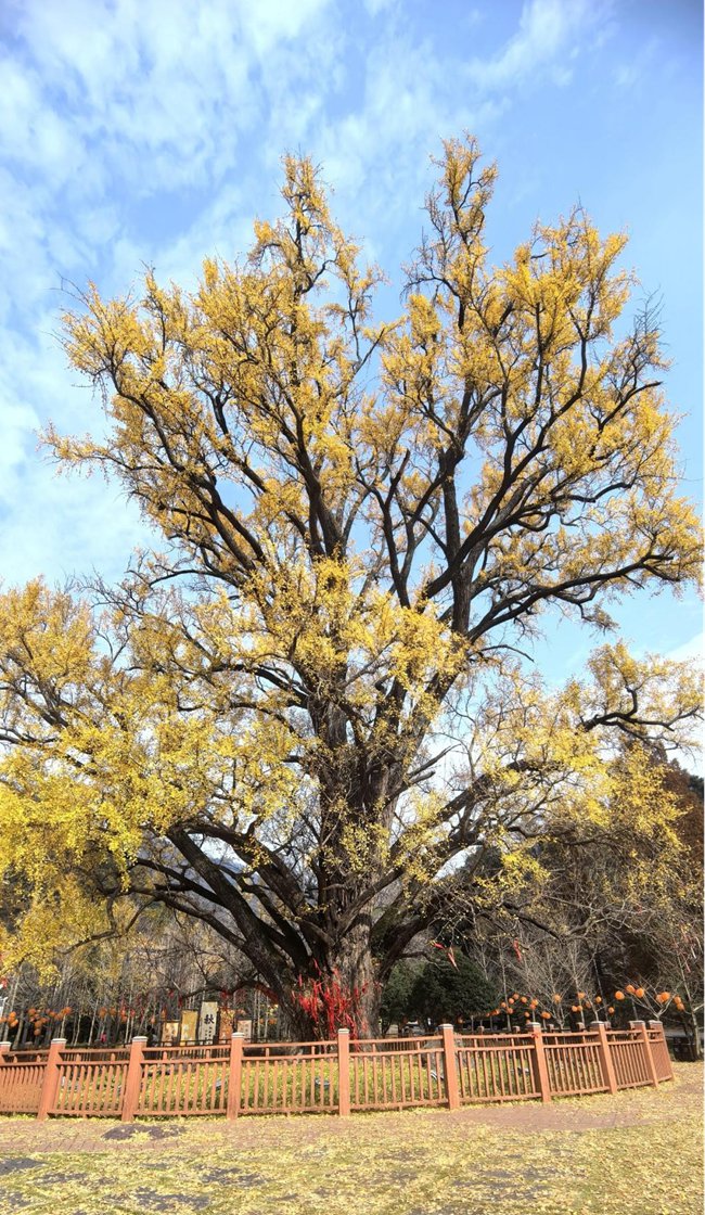 千年银杏王在金秋时节,满树叶片化作耀眼的金黄。阳光透过枝叶洒下,地面铺满“金毯”;风吹叶动时“金蝶”纷飞,与四周层林尽染的远山近峦相映,壮观又治愈。