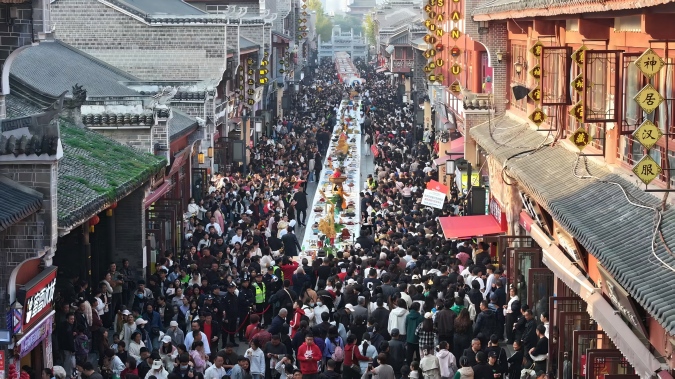 三地联动燃文旅,古城襄阳宴八方。11月15日,“知音湖北超级文旅日”・17寻味荆楚活动在武汉、襄阳、咸宁三地同步启动,以美食为纽带激活文旅消费,奏响荆楚大地文旅融合发展的协同乐章。其中,襄阳古城北街以“逛襄阳吃江湖”为主题打造特色文旅嘉年华,襄厨争霸、百米长桌宴、非遗文创展演、全城乐购等活动多点开花,吸引众多游客不断涌入,在青石板路间沉浸式感受古城的千年底蕴与现代活力。