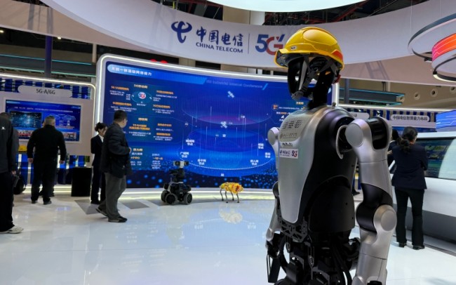 互动体验展区,多款机器人及智能设备在现场模拟的工业场景中高效运作,一款人形机器人展示了基于5G确定性专网的汽车质检巡检应用,其灵活作业能力和AI视觉检测技术,吸引了众多参观者驻足。