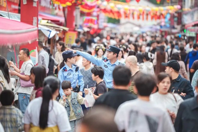 ▲国庆期间,荆州市公安局沙市区分局民警在大赛巷小吃街巡逻