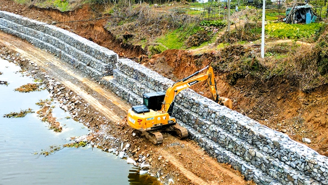 该段河道弯道较急,临水一侧因河水常年冲刷形成近4米垂直崩岸,严重威胁岸上农田和农业生产安全。治理中,施工方先进行抛石固脚,再分层垒筑格宾网笼,并依地势放坡、铺植草皮,使河岸与自然水流和谐衔接。