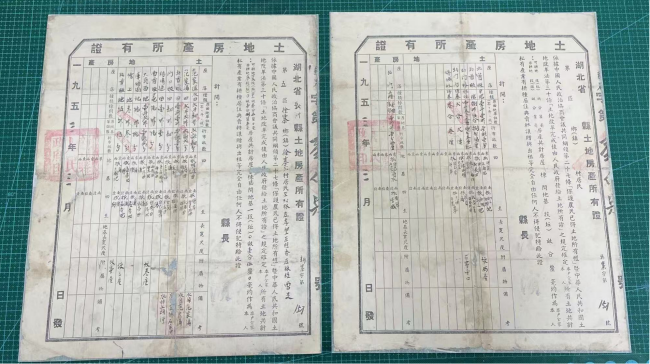 据历史资料记载,1950年,中央人民政府颁布《中华人民共和国土地改革法》,一场摧毁封建土地所有制的革命在全国铺开,湖北省于1952—1953年完成全省农村土改任务。这两张《土地房产所有证》,就是当时农民“耕者有其田、居者有其屋”的法律凭证。证书上清晰记载着户主姓名、家庭人口、土地房屋的坐落、四至、面积等核心信息,以官方公信力终结了湖北农村数千年“地主占有、农民佃耕”的剥削制度。