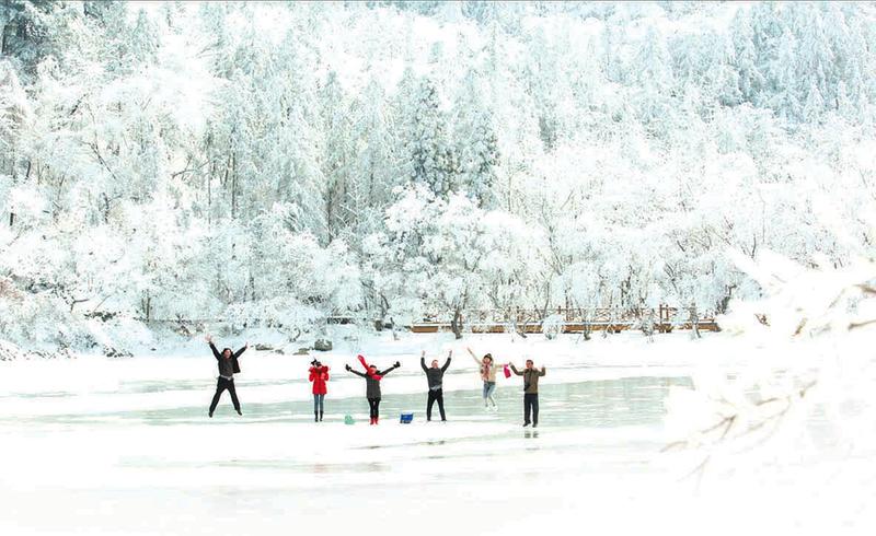 又用十几分钟到达白龙池畔。这是一处隐世的湖,在海拔七八百米的几座山峰之间,竟然藏着一方小巧的湖!这种高山淡水湖在中国亦不多见。夏日温润如碧玉的湖面消失不见,取而代之以厚厚的冰层!湖的四周,山峰高耸,密林披雪,雪色纯净而耀眼,气氛静谧而空灵。时间仿佛静止了。山中一捧雪,足以慰风尘。朋友们滑冰,打雪仗,去无人涉足的地方踩一行专属于自己的脚印,仰面倒地印上自己的身形,去湖边树林中寻找小兽的足迹……红色羽绒服和各色围巾、帽子特别显眼。湖边的菖蒲,顶着薄雪,绿得精神。湖北面堤坝上栽种的几棵榆柳,疏密有致,叶子落净,树干深黑,俨然成画。从湖边木质栈道北望宝珠峰上的寺院建筑,仿佛仙山楼阁。几位携带无人机的摄影师,在调试机器航拍大洪山雪景。从高空俯视群山,才知道这世界远比我们想象中的宽阔。他们拍出的山峰上的积雪,竟然有一种神秘的幽蓝。停于湖边公路的四驱车上,走下一位梳汉髻、着红色汉服的模特,坐湖边圆凳上。助手帮她将长得有些夸张的裙摆向左右手方向披散开,递上一张七弦古琴。红衣女子抚琴一曲《梅花三弄》。摄影师忙着拍照。一半是冰雪,一半是火焰!游人纷纷惊叹这唯美的画面。我觉得他们是一群灵魂有趣的人——穿越时空,一眼千年,用自己喜欢的的方式触摸大洪山的雪,只为取悦自己,将人与风景的相遇演绎成了绝唱。这世间许多美好的东西,往往既在物质之中,又飞跃物质之上,就像腊梅的香味那样抚慰人心。